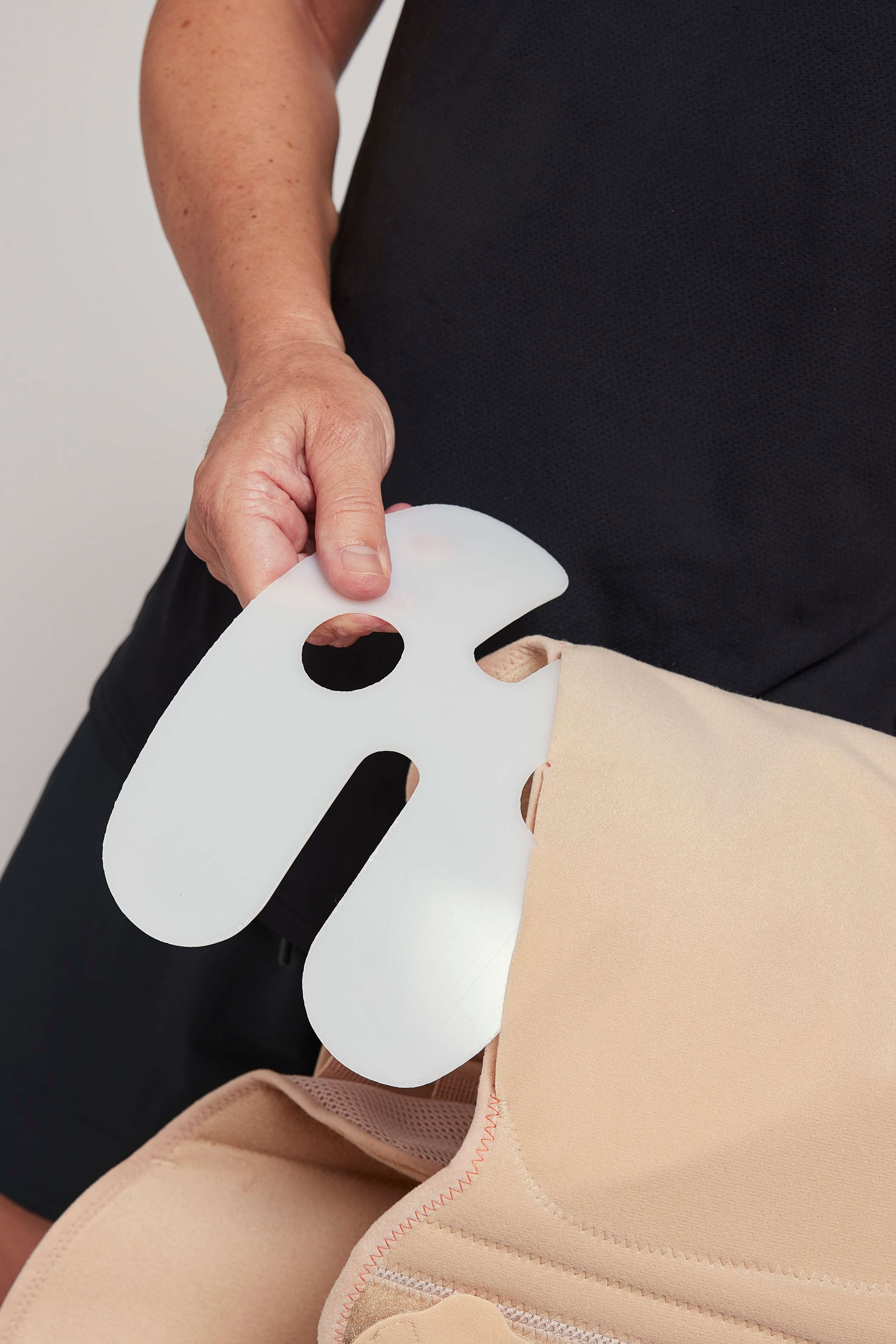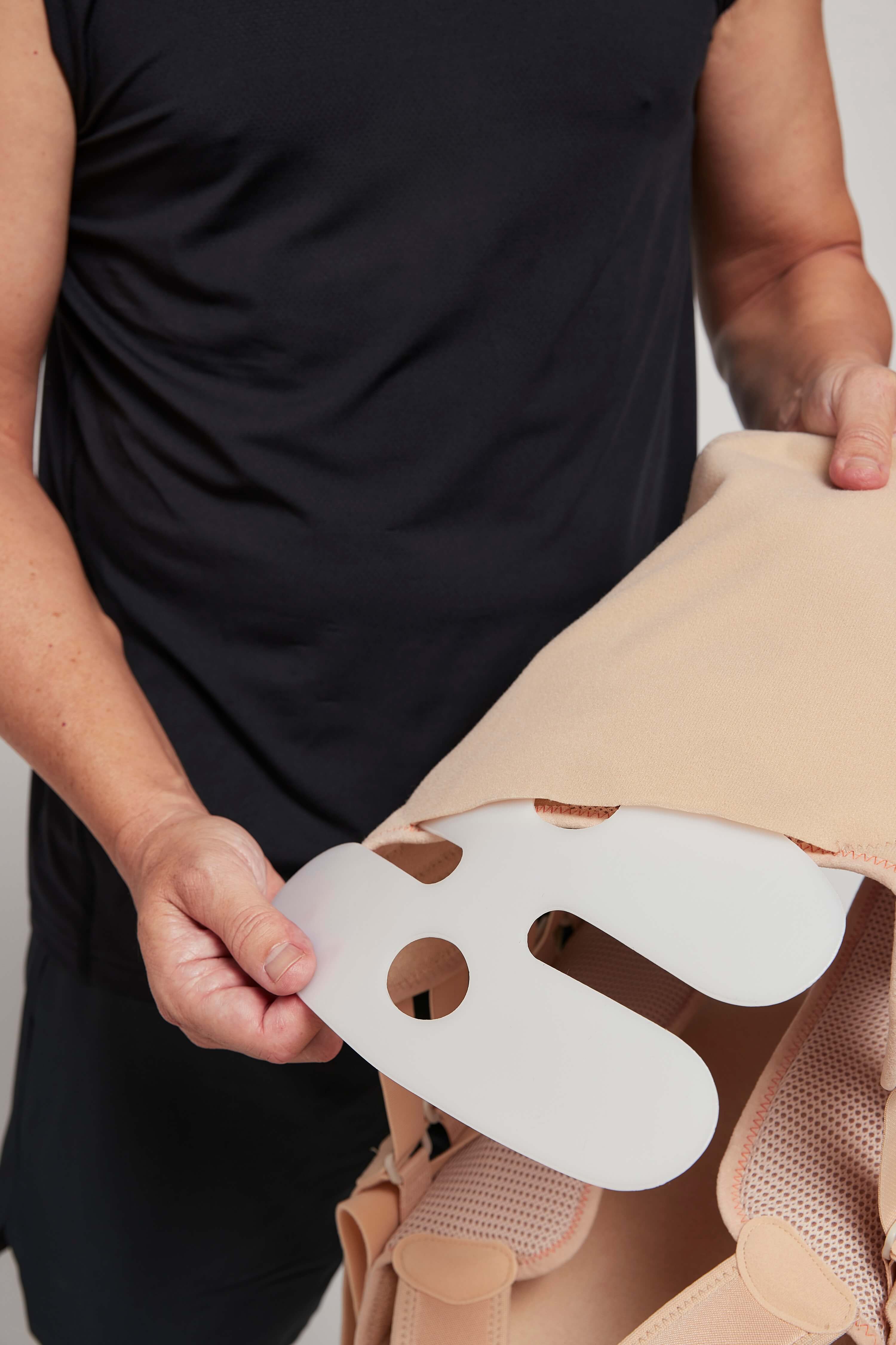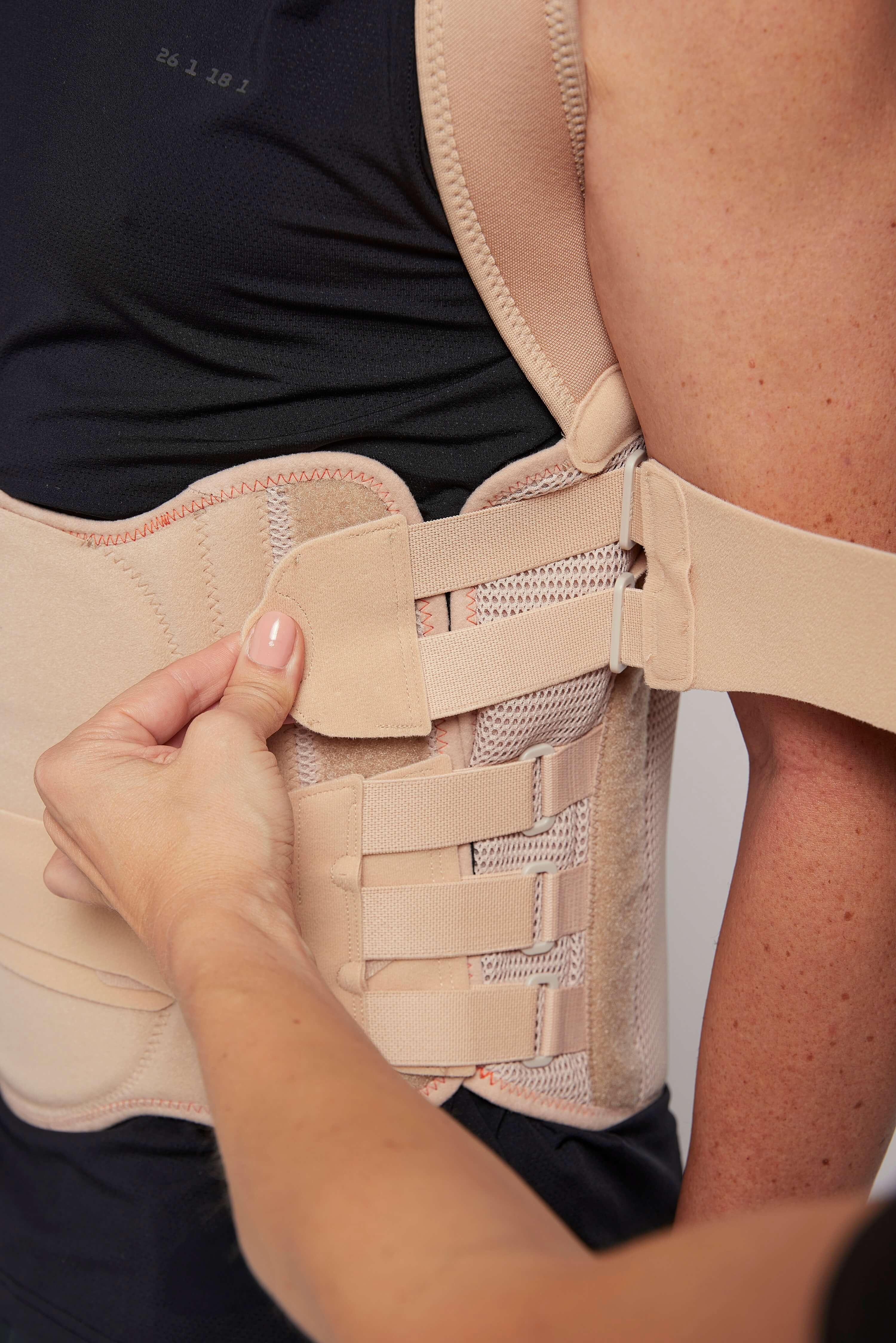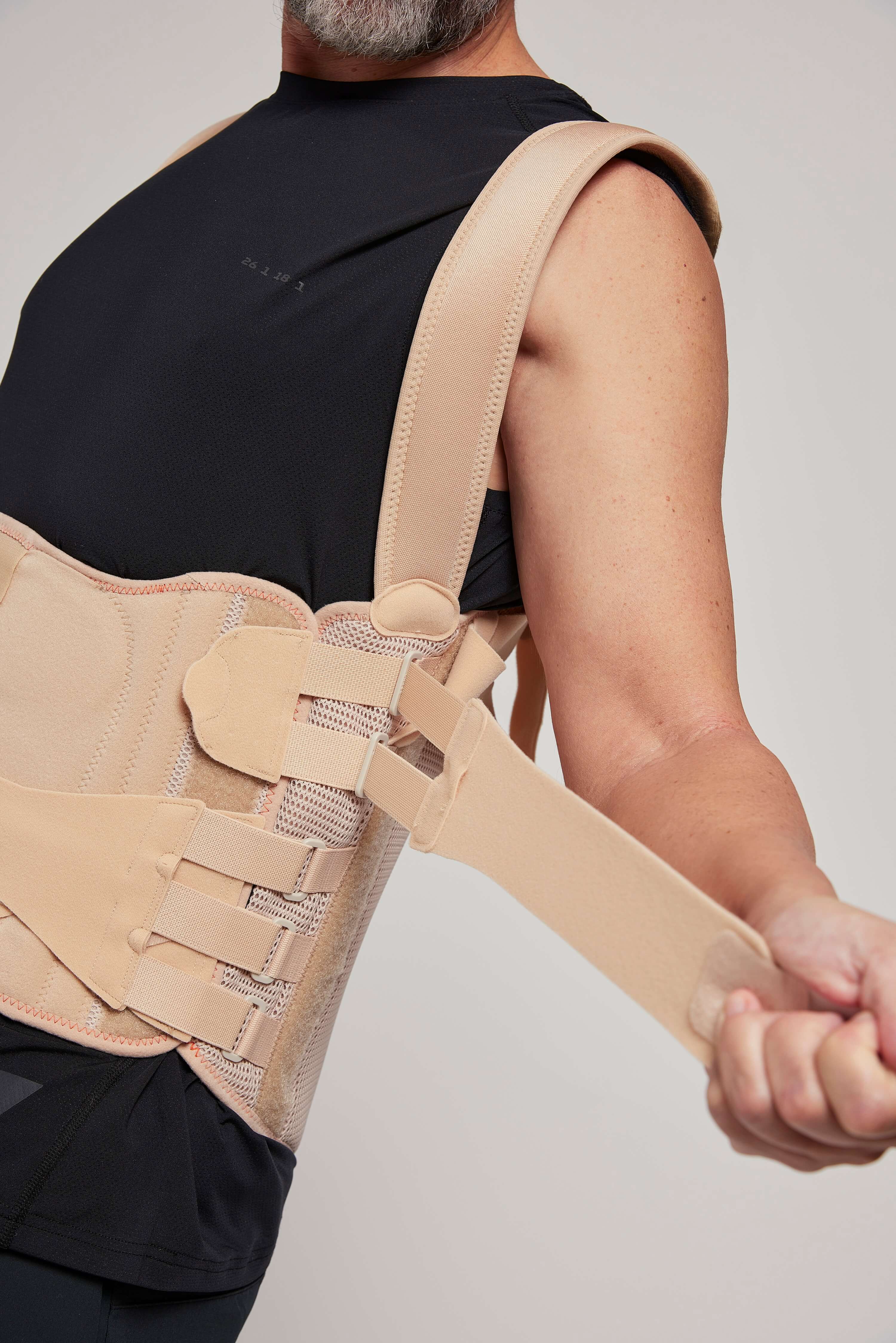 - Передняя и задняя жесткие части корсета независимы друг от друга, благодаря чему корсет плотно прилегает и лучше стабилизирует позвоночник. Также есть возможность регулировки по объему в случае изменения веса пациента в процессе лечения.